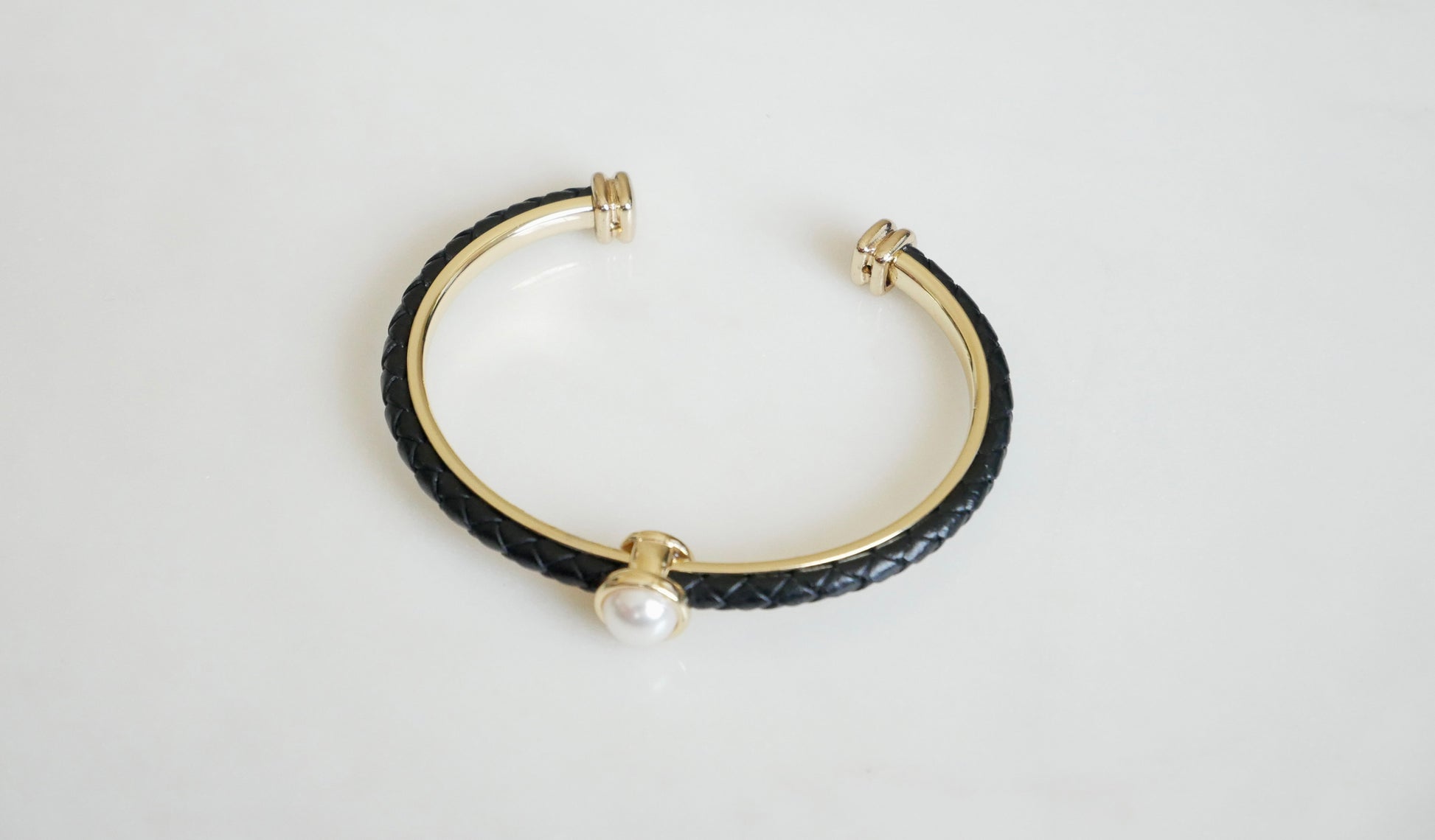 Sleek and modern, The Annette cuff strikes the perfect balance between bold edge and timeless elegance. Designed with a gold-tone open cuff, it’s accented by a woven black leather band that adds texture and depth. A luminous pearl centerpiece completes the design, giving it a refined touch of sophistication.
