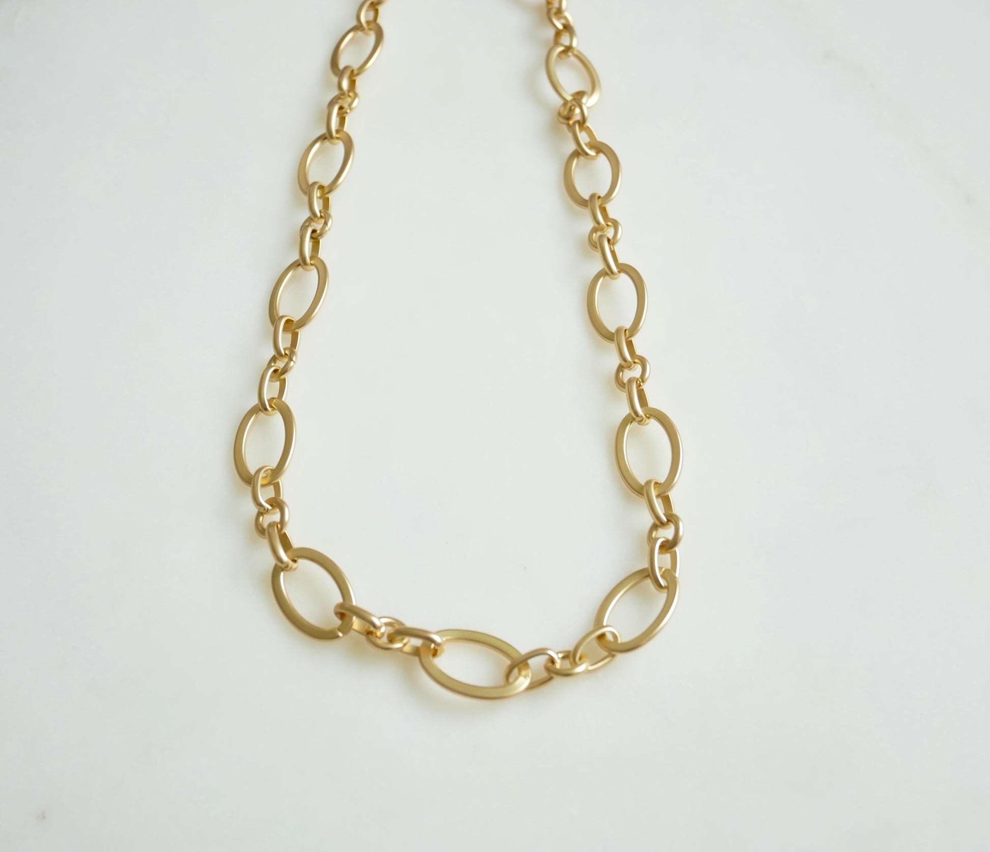 Make a bold yet timeless statement with this gold oval link chain necklace. The Aria Necklace is designed with alternating large and small oval links, it blends modern edge with classic elegance. The smooth gold finish adds a touch of luxury, making it the perfect piece to wear solo for a minimalist look or layered with other necklaces for added dimension.