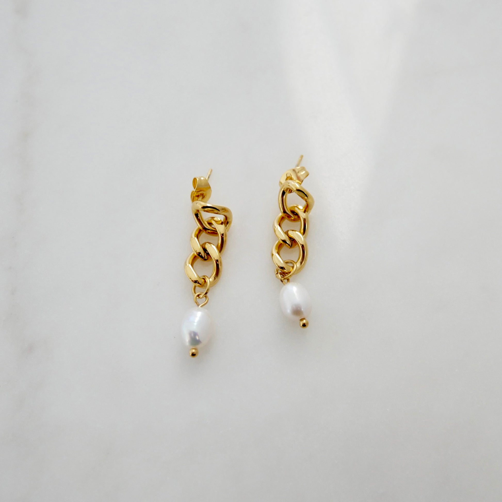 Effortlessly elegant with a touch of modern edge, The Bianca Earrings blend bold design with timeless beauty. A polished gold chain link gracefully suspends a luminous pearl, creating the perfect harmony between strength and softness. Designed to elevate any look — from everyday minimalism to evening sophistication.