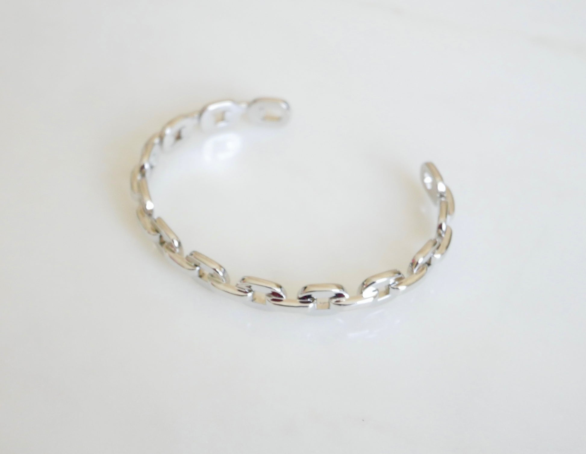 Modern and sleek, The Carlita Bracelet offers a fresh take on chain-link design with its polished silver-tone finish. Its open cuff style combines bold structure with everyday wearability, creating a versatile piece that works effortlessly from day to night.