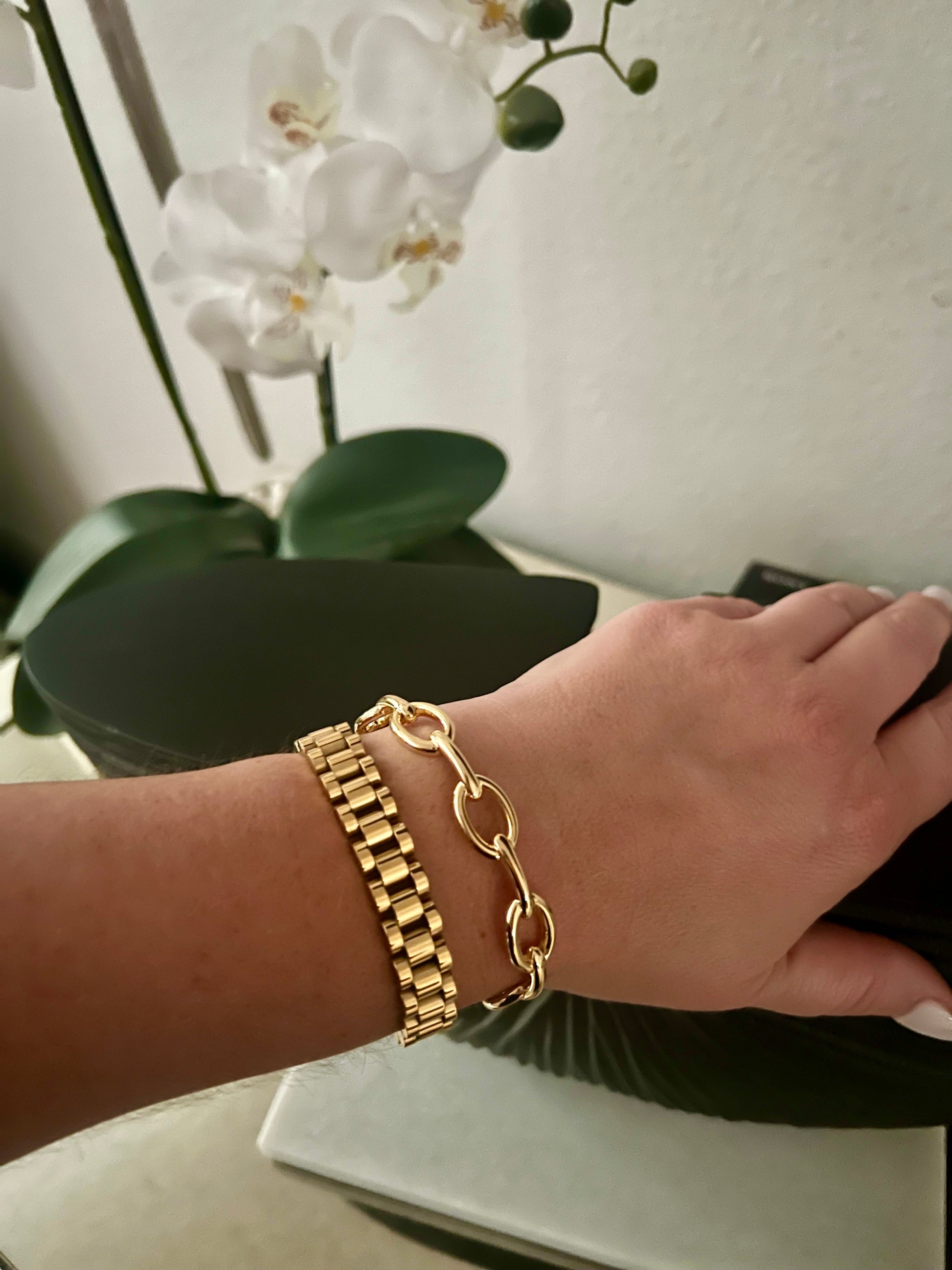 Chic and contemporary, The Chiara Bracelet reimagines the classic chain with a modern open-cuff design. Featuring polished gold-tone oval links, this bracelet strikes the perfect balance between boldness and elegance. Its open silhouette makes it easy to slip on and off, while the glossy finish ensures it catches the light beautifully.