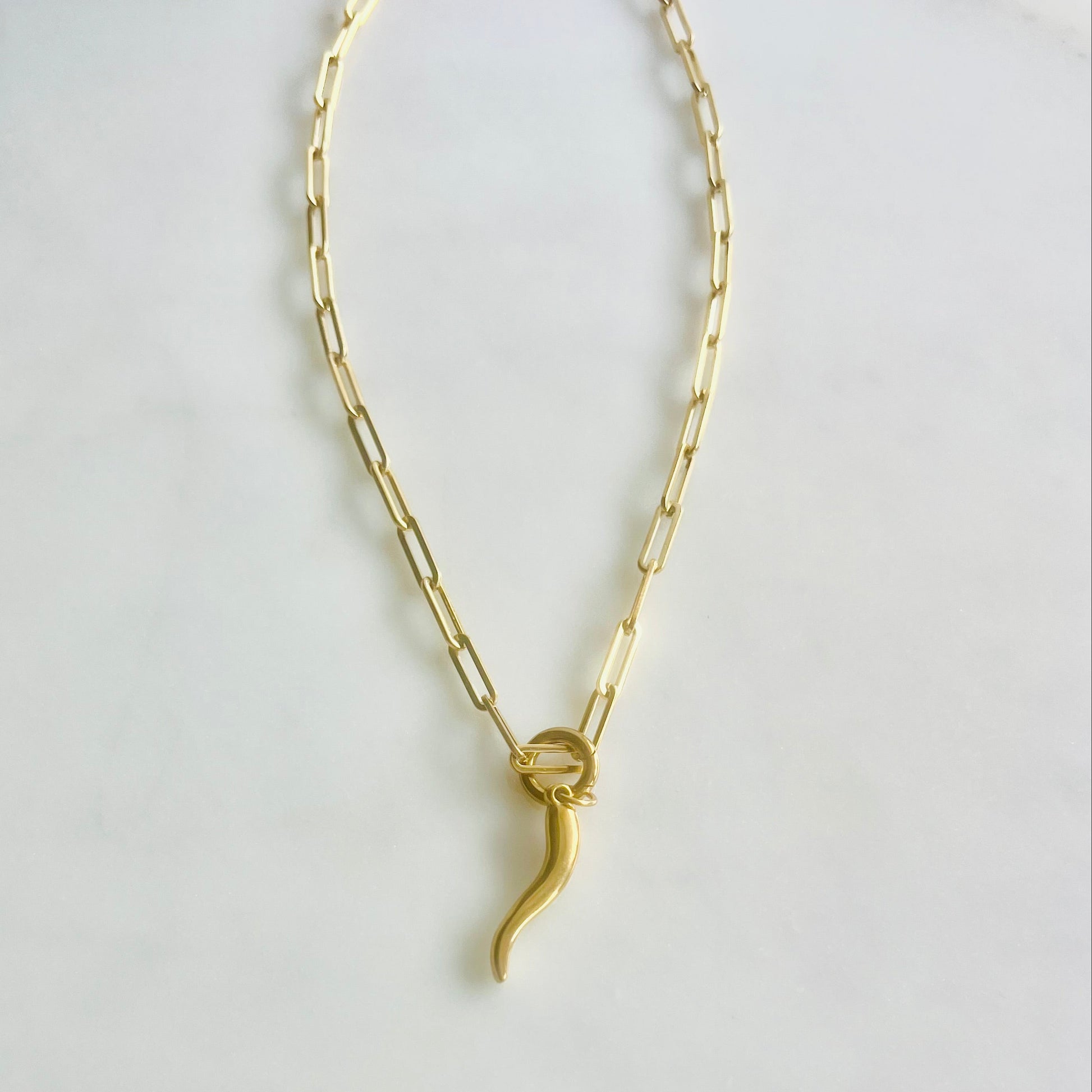 The Cornicello Necklace is a modern take on a timeless Italian symbol, the Italian horn is worn for protection, strength, and good fortune. Designed with a bold, sculptural pendant and elongated chain, it brings effortless edge to everyday styling.