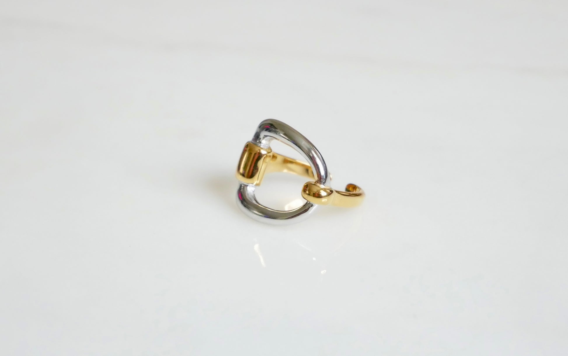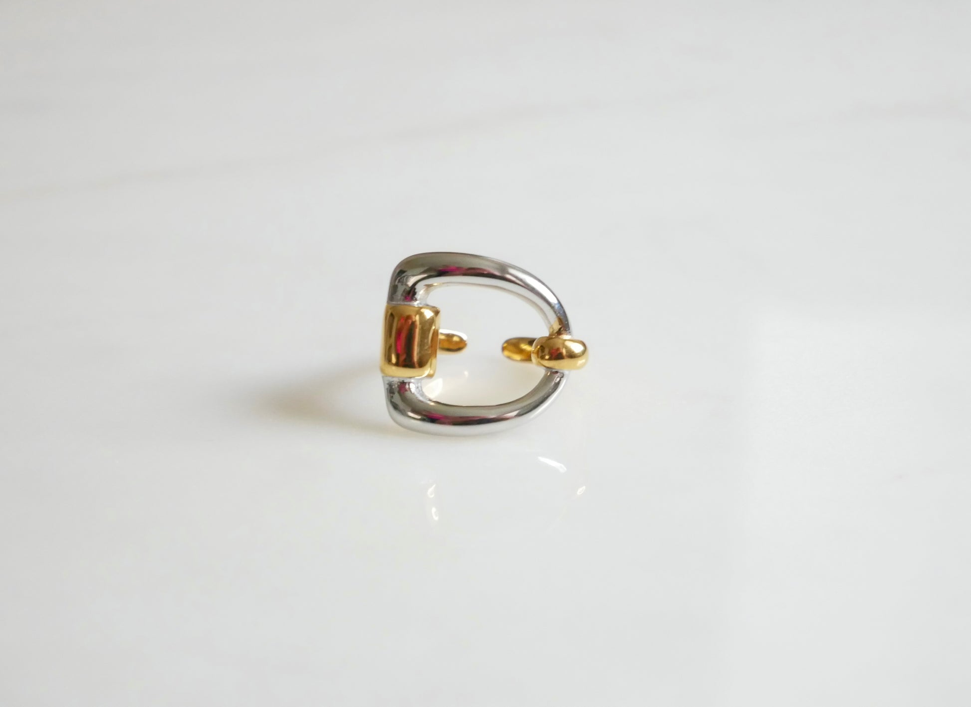A modern statement with equestrian-inspired elegance. The Dominica Ring features a sleek open design with contrasting gold and silver tones, reminiscent of a polished buckle motif. Its unique structure blends boldness with sophistication, making it the perfect accent for both casual and dressy looks.