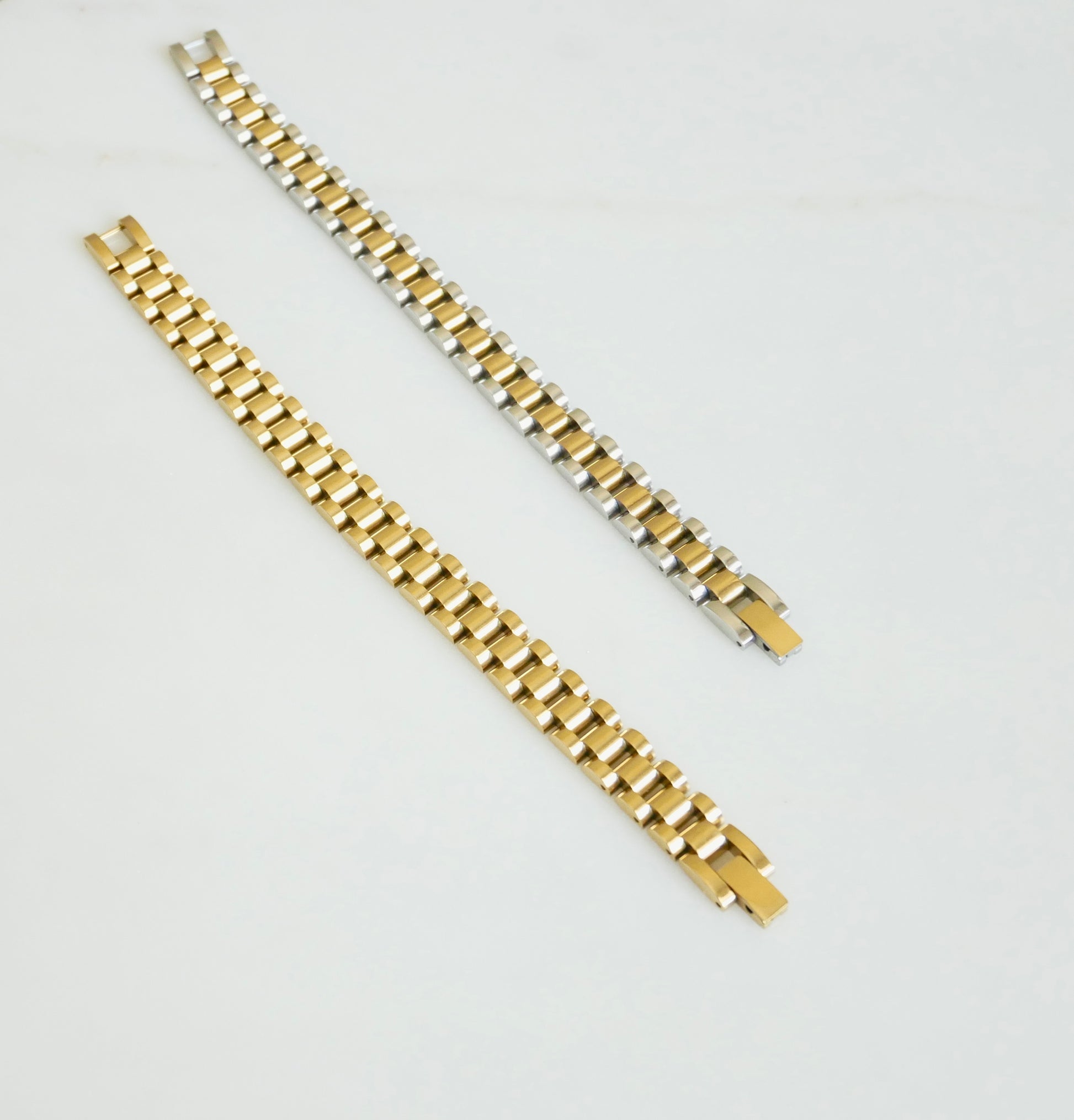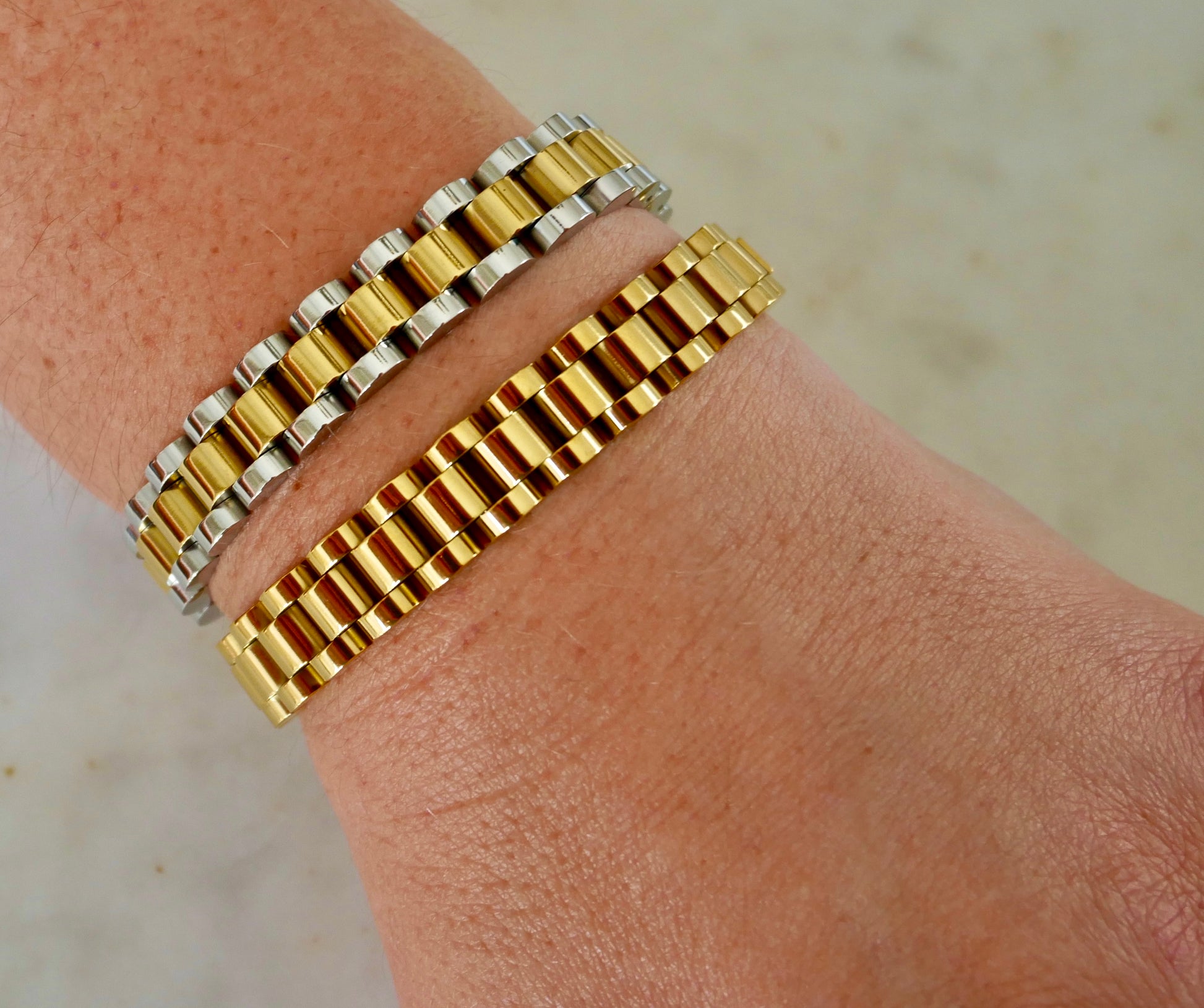 Elevate your everyday style with The Julia Watch Band Bracelet, a bold fusion of modern elegance and timeless design. Crafted with stainless steel and 18k gold-plated links. This bracelet brings the classic sophistication of a luxury watch band into a versatile accessory.