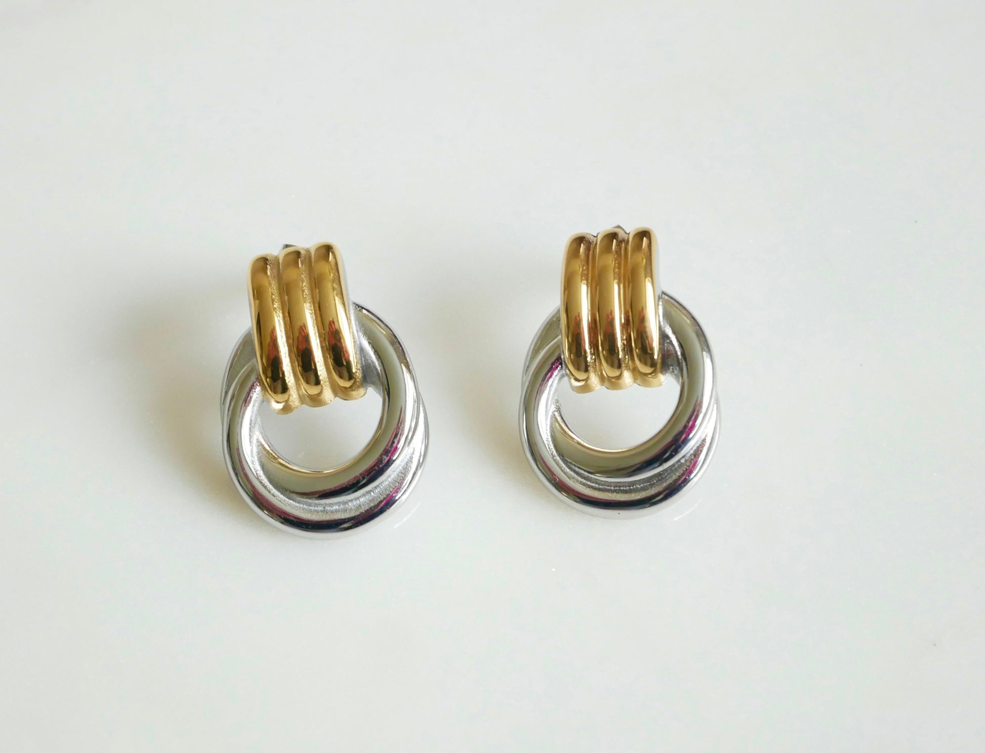 Timeless with a modern twist, The Karina Knot Earrings feature an interwoven design that symbolizes strength and unity. Crafted in a striking two-tone mix of polished gold and silver, these earrings bring versatile elegance to any look. Bold yet sophisticated, they’re perfect for elevating everyday style or adding a sleek finish to evening wear.