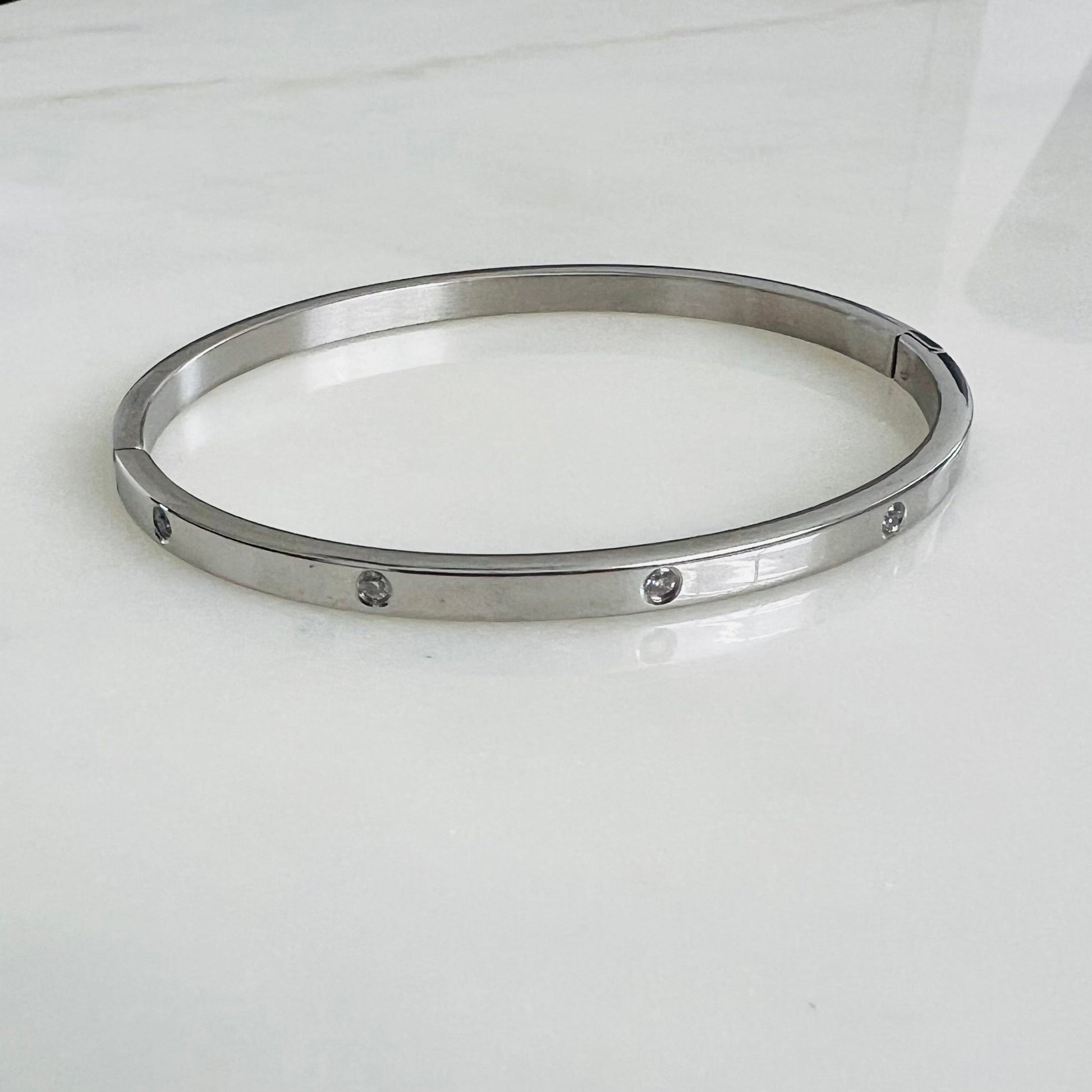 The Marie Bracelet is a sleek silver bangle accented with sparkling stones. It is minimalist, modern, and perfect for stacking or wearing it solo.