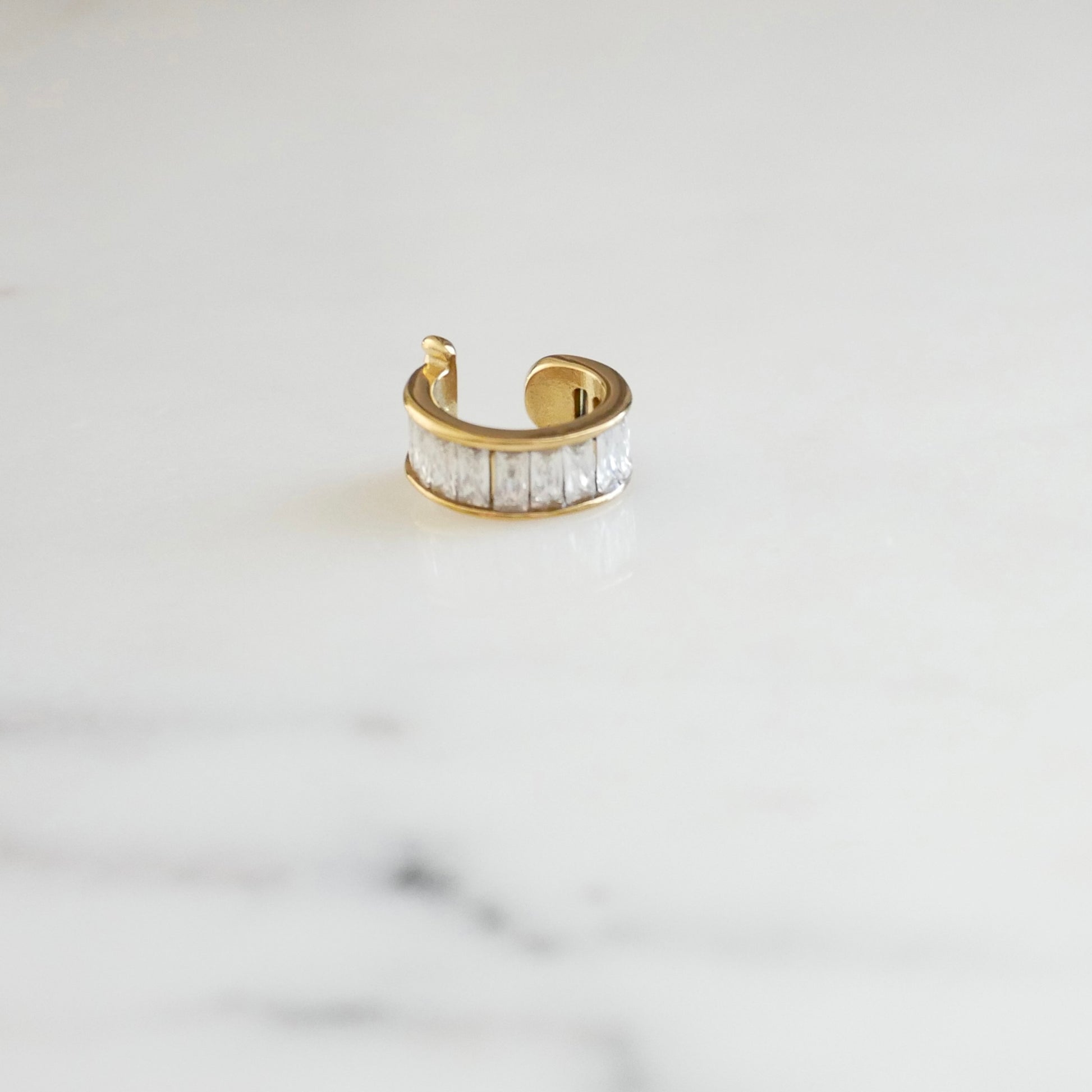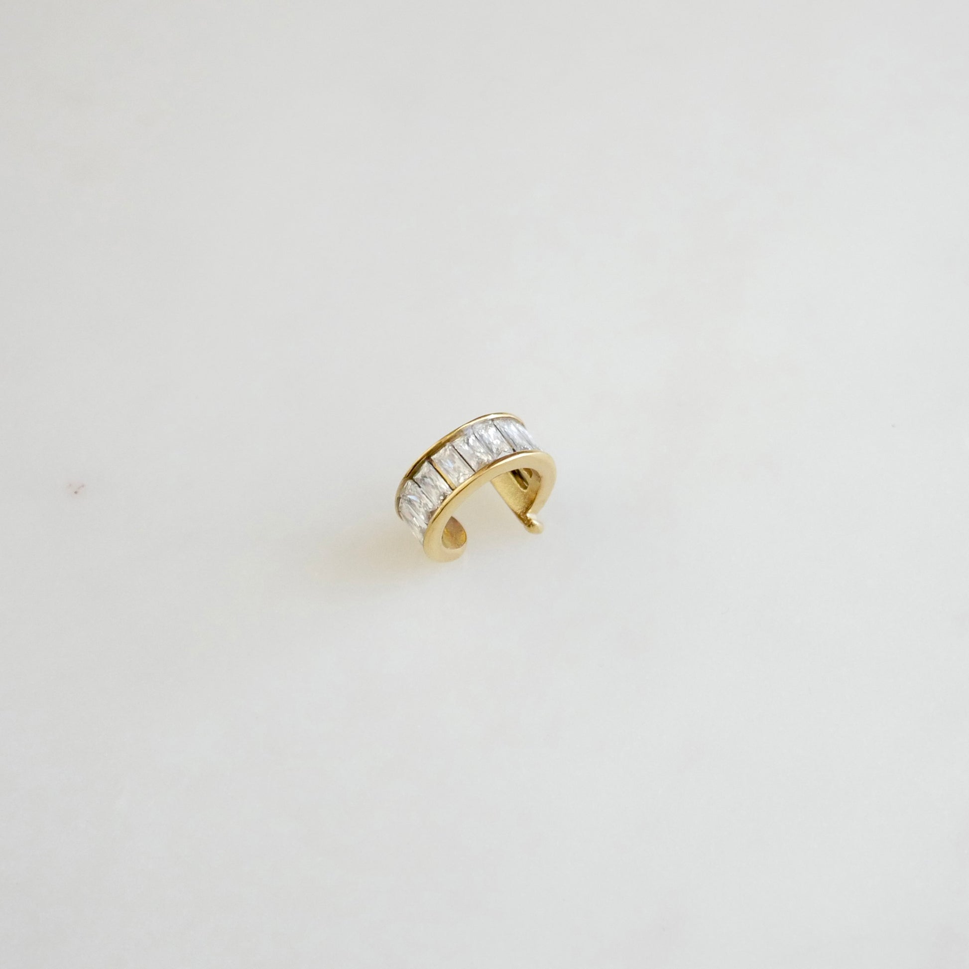 The Mila Ear Cuff features a sleek row of radiant baguette-cut stones framed in polished gold. Designed for effortless styling, this no-piercing ear cuff adds a refined touch of sparkle that feels modern and elevated.
