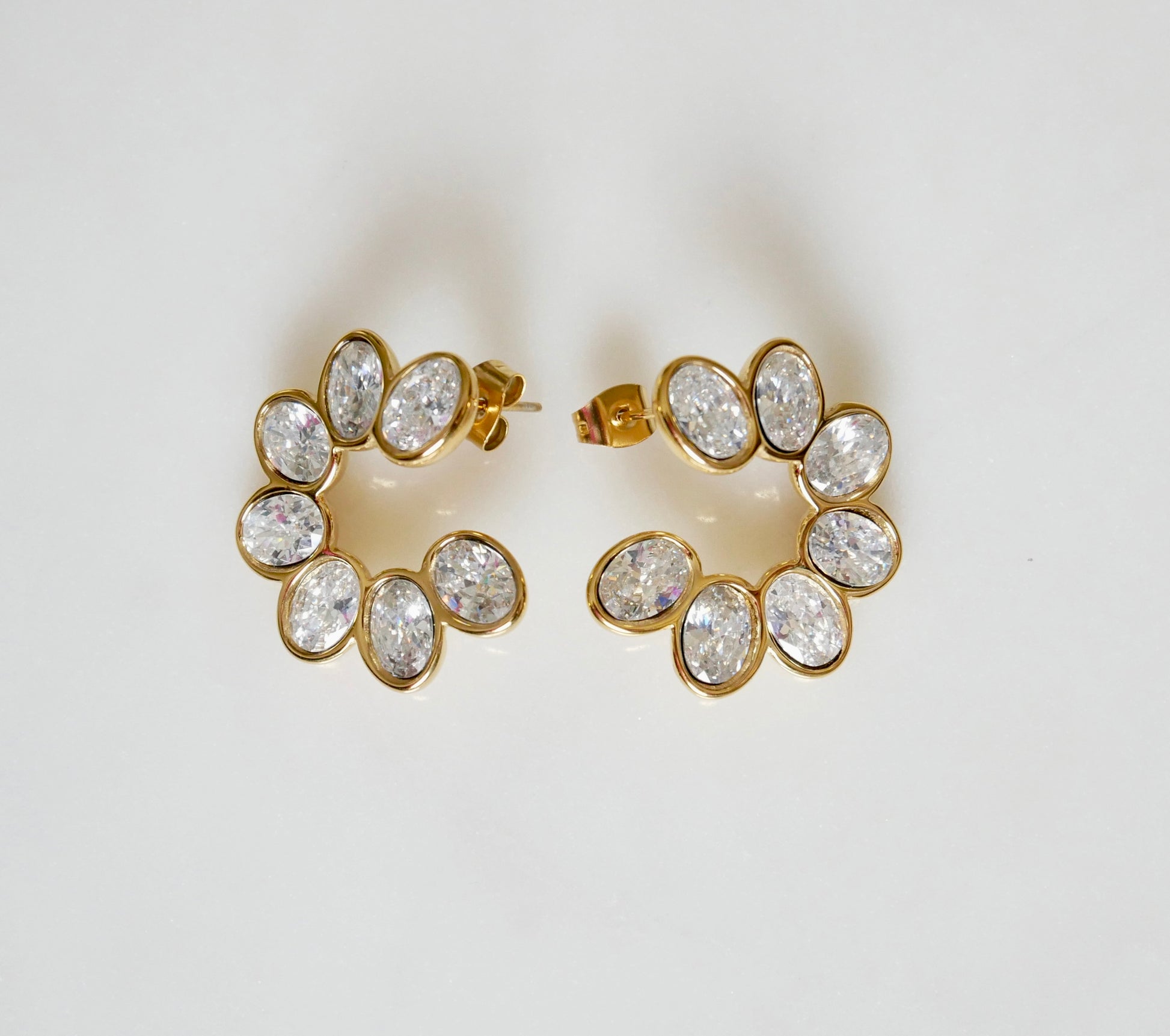 Radiant and refined, The Rosa Earrings are designed to bloom with brilliance. Featuring marquise-cut CZ stones set in a floral-inspired hoop silhouette, these earrings combine delicate elegance with modern glamour. The gold-plated setting enhances the sparkle, making them a versatile choice for weddings, evenings out, or simply adding a touch of luxury to your everyday look.