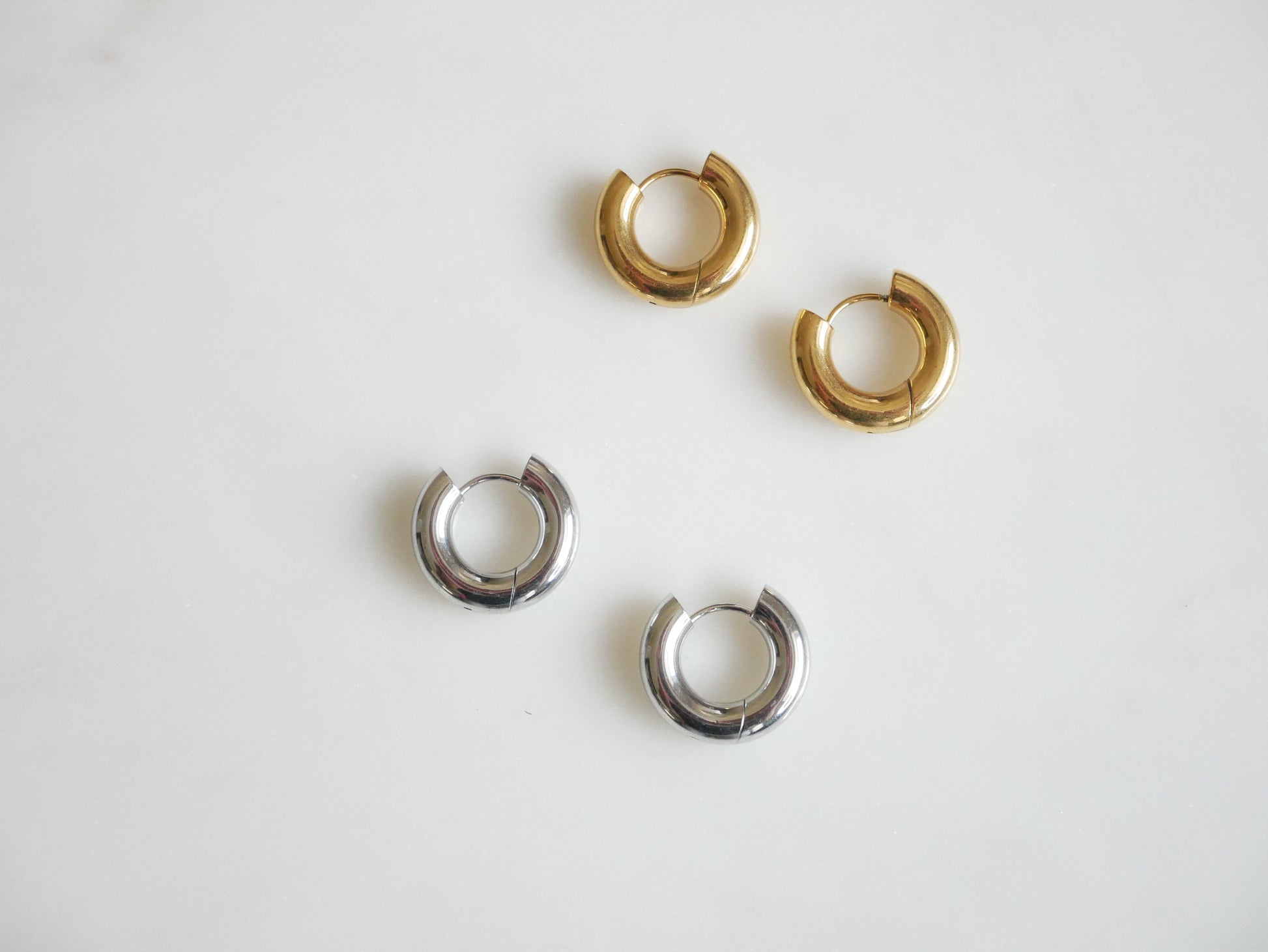 Effortless style with a bold twist. The Viva Earrings feature a chunky huggie hoop design in a sleek high-shine finish, available in both gold and silver tones. Their versatile silhouette makes them a must-have staple—easy to wear solo for a minimalist vibe or layered with other hoops for a stacked statement.